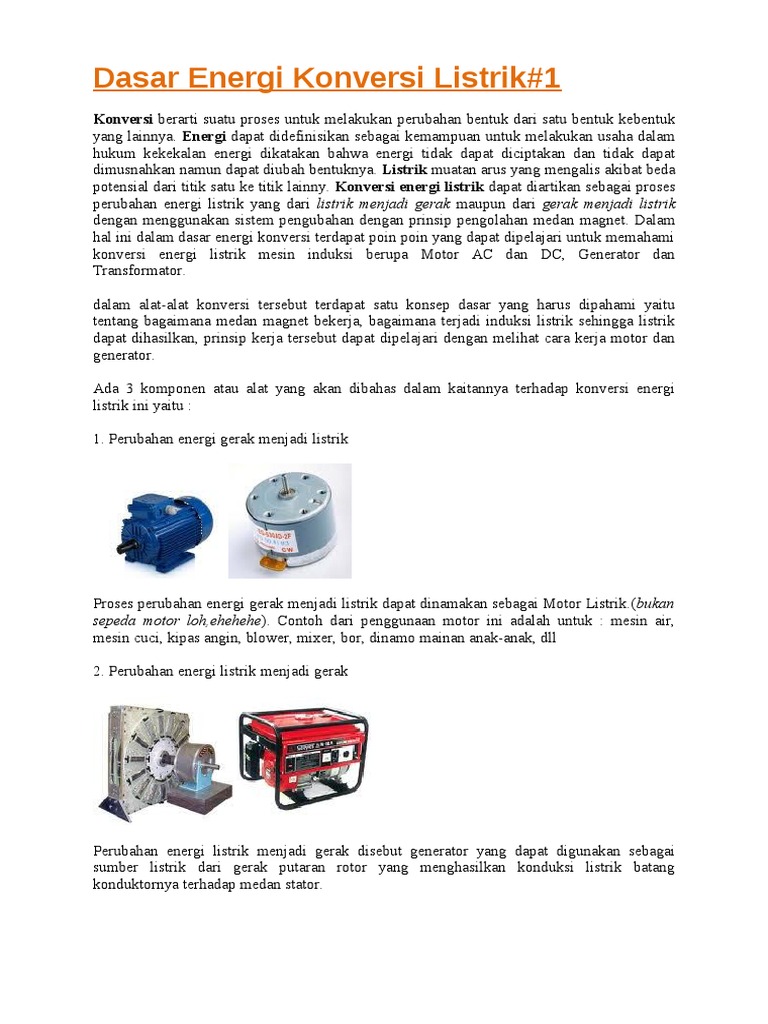 Alat alat lain yang memanfaatkan perubahan energi listrik menjadi energi gerak antara lain mesin cuci dan mixer. Kata energi berasal dari bahasa yunani yaitu ergon yang berarti kerja. Energi listrik dapat juga berubah menjadi energi gerak. Contoh perubahan energi perubahan energi adalah suatu perubahan energi dari satu bentuk ke bentuk yang lain.