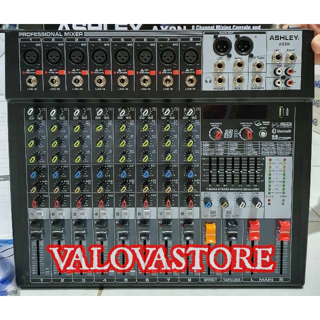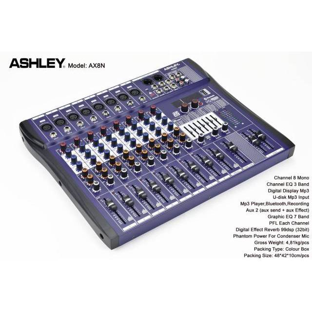 Ashley audio mixer ashly ax8n ax 8n 8ch full usb mp3 bluetooth. Harga murah di lapak bluestar elektronik. Mixer ashley ax8n bluetooth original 8 channel speksifikasi channel 8 mono channel eq 3 band digital display mp3 u disk mp3 input mp3 player bluetooth recording aux 2 aux send aux effects graphic eq 7 band pfl each channel digital effect reverb 99dsp 32bit phantom power for condenser mic product size. Harga mixer audio ashley ax8n 8 channel original product ashley.