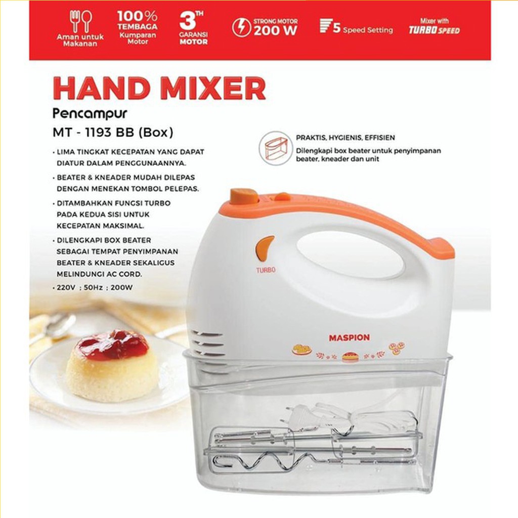 Mixer maspion mt 1193. Hadir dengan 5 pilihan kecepatan yang super dengan teknologi turbo speed sehingga ideal untuk mencampur mengocok dan mengaduk dan dilengkapi dengan 2 buah pengaduk dan pengocok telur yang membuat proses membuat adonan menjadi lebih kalis. Dilengkapi dg tempat utk menggulung kabel 5 kecepatan. Mixer ini hadir dengan 5 pilihan kecepatan dengan teknologi turbo speed yang ideal untuk mencampur mengocok dan mengaduk dan dilengkapi dengan 2 buah pengaduk dan pengocok telur yang membuat proses membuat adonan menjadi lebih kalis. Harga maspion mt 1193 hand mixer putih orange termurah september 2020 cicilan 0 gratis ongkir 100 original pembayaran aman mudah.