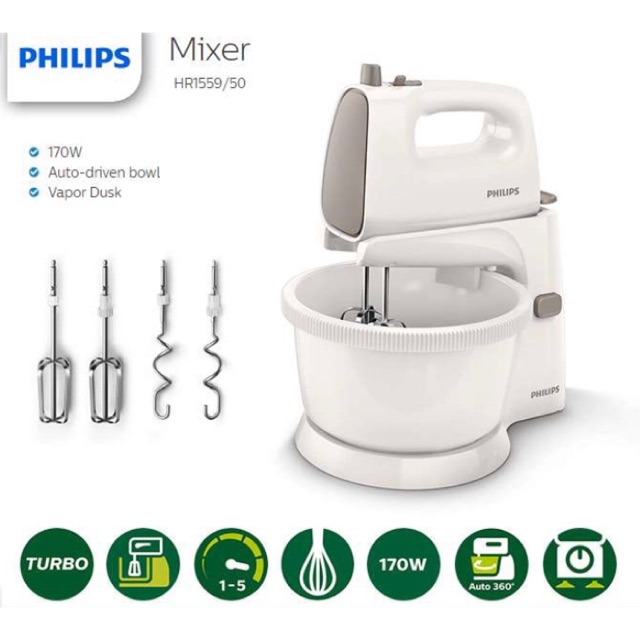 Daftar harga peralatan mixer berdiri philips hr 1559 baru dan bekas second termurah di indonesia. This philips mixer has matching shape of conic beater and automatic driven bowl that enables maximum incorporation of air allowing shorter whipping mixing time and smoother cake batter see all benefits. Mixer philips ini memiliki pasangan pengocok berbentuk kerucut dan mangkuk yang digerakkan otomatis yang memungkinkan pencampuran udara lebih maksimal sehingga waktu pengocokan pencampuran lebih singkat dan adukan kue yang lebih halus. Bandingkan dan dapatkan harga terbaik sebelum belanja online.